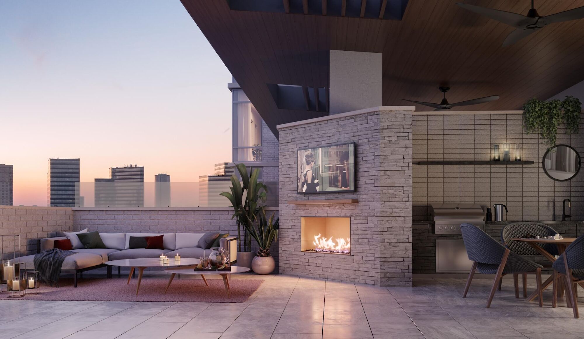 Crimson Townhomes have their own residential atmosphere with a unique three-story layout. Living, kitchen, and dining area are centrally located and accessed from the entry level; private bedroom suites are located on the lower level with private direct access to the community courtyard; while the upper level provides a family room and private rooftop terrace with an outdoor fireplace and shaded outdoor grilling kitchen.
