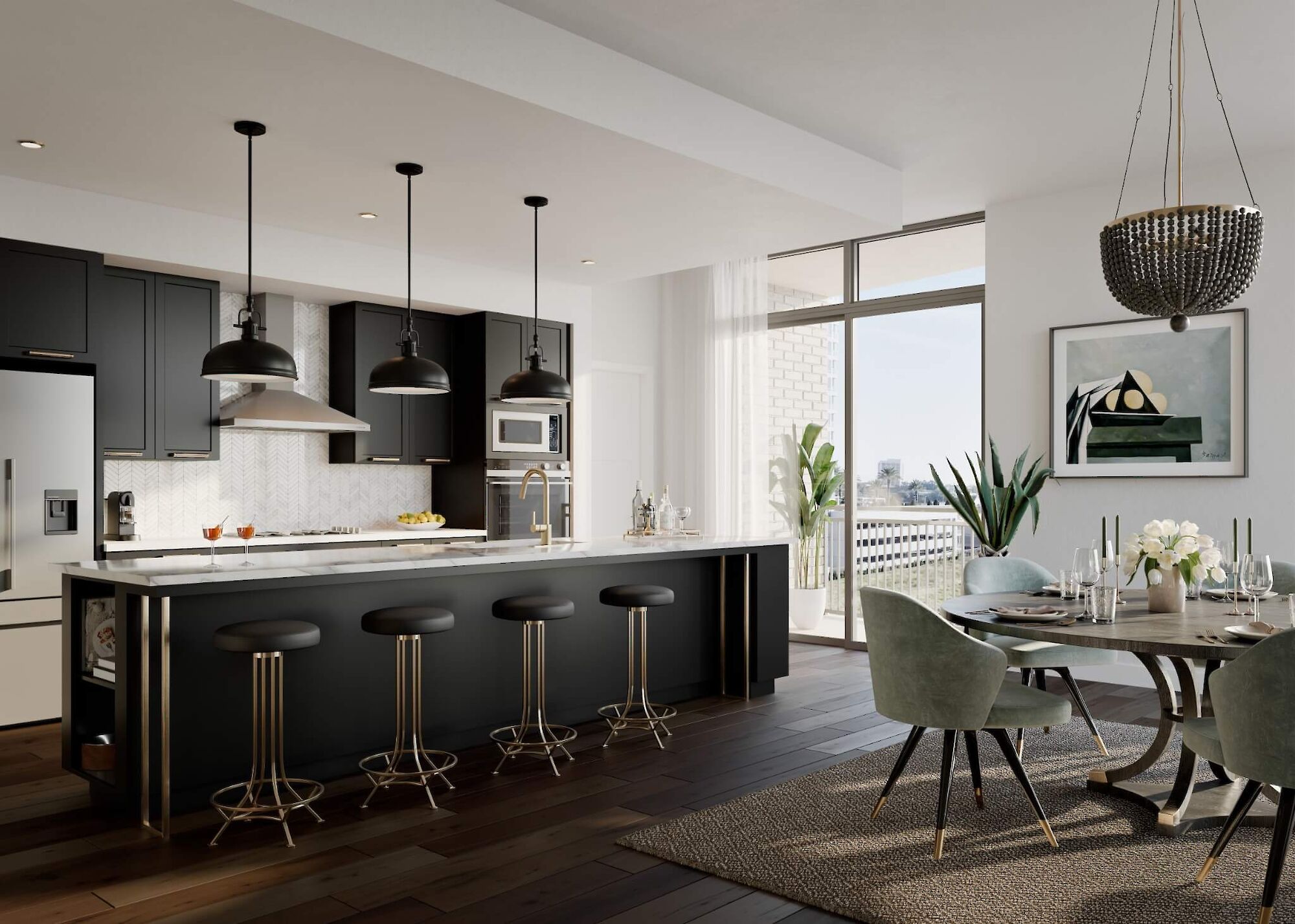 The Penthouses are exemplary of Crimson quality. These generously sized homes are enhanced with extended ceiling heights of 14’, an upgraded appliance package featuring Wolf and Fisher & Paykel, expanded smart home lighting controls, and scenic Galleria or Downtown skyline views.